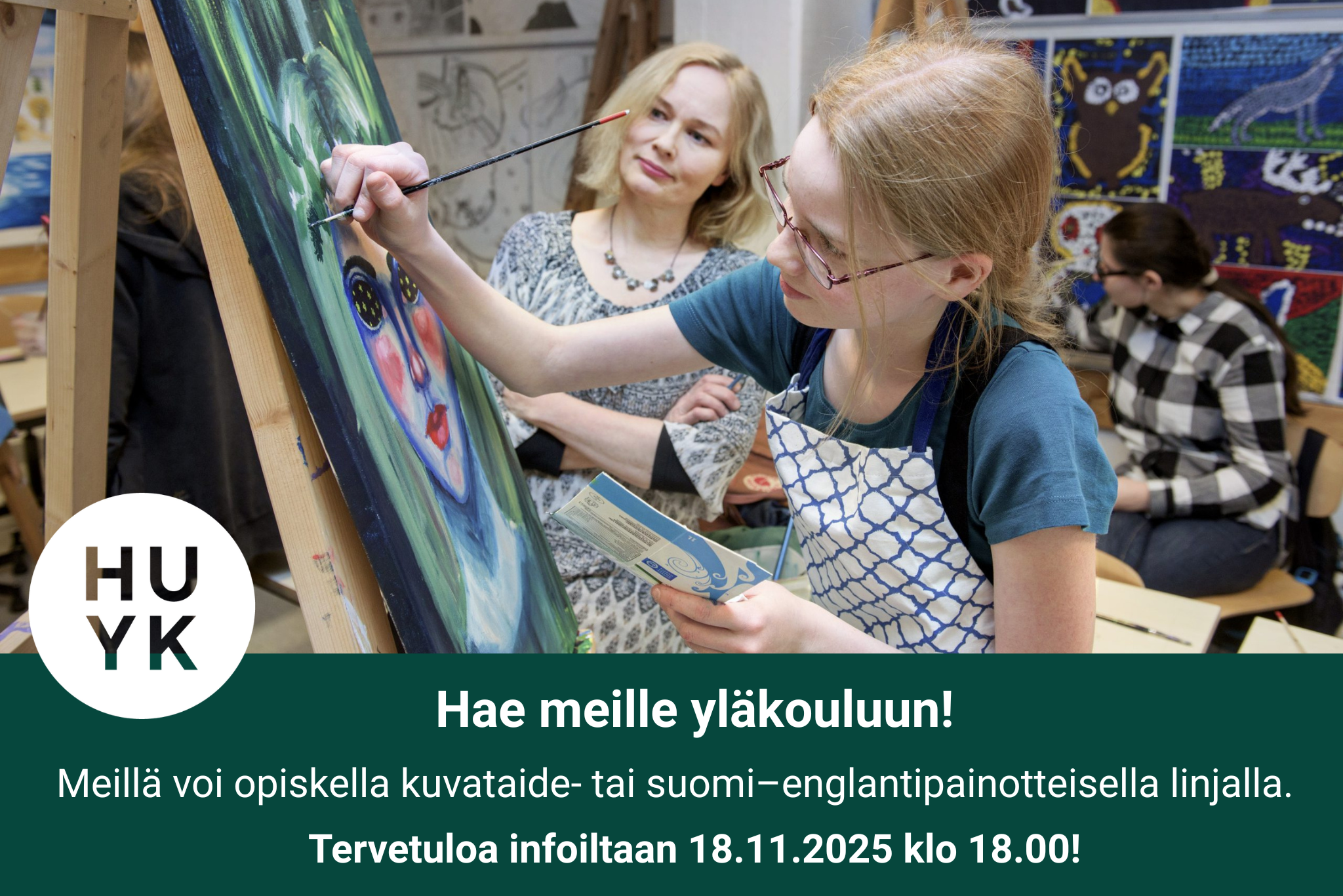 Haku koulumme perusopetuksen 7. luokalle, yleislinjalle ja painotettuun opetukseen syksyllä 2026 tehdään 2.1.-16.1.2026. Ohjeet löytyvät täältä: www.huyk.fi/ylakoulu/hae-meille-ylakoulu/